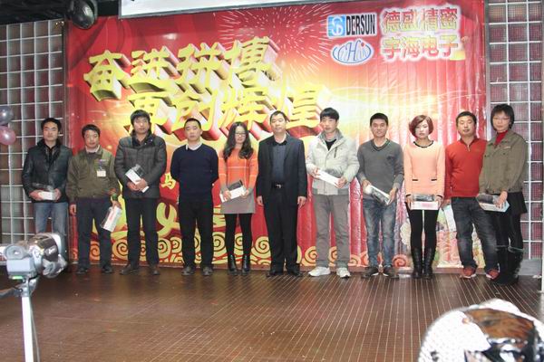 尾牙晚宴除了各位同仁们最关心的抽奖活动以外,还进行了节目表演及颁发2012年优秀员工奖.董事长于晚宴致词中提到,2013公司在严峻的市场竞争下,业绩仍保持稳定增长。海外市场的拓展给公司的品质、服务带来了新的机遇与挑战。 公司的各项管理持续有序发展,逐渐走上规范化管理。